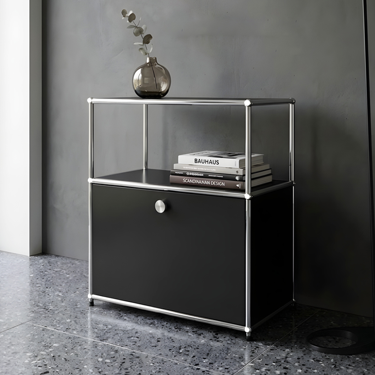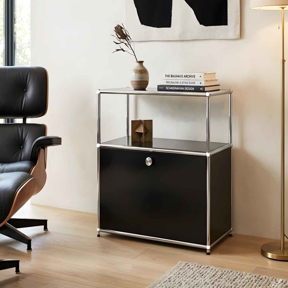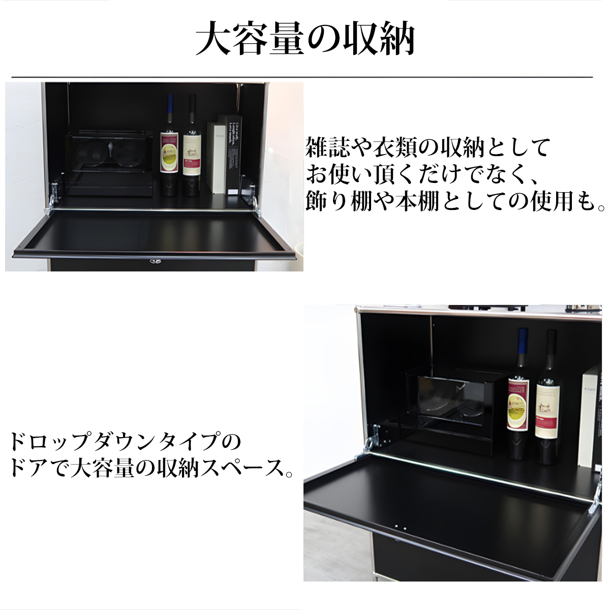ドロップダウンドアと上部の収納スペースが付いたサイドボード。