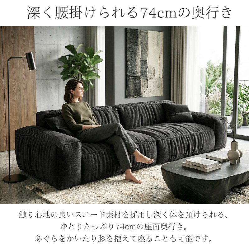 コンパクトに圧縮された状態で届きつつも、復元後はしっかりとした厚みと弾力があり一般的なソファと変わらない快適な座り心地を実現。座面奥行きは74cmの広々としたサイズ感で、深く腰を掛けたりあぐらをかいても窮屈感が無く、ゆったりとくつろいでいただけます。