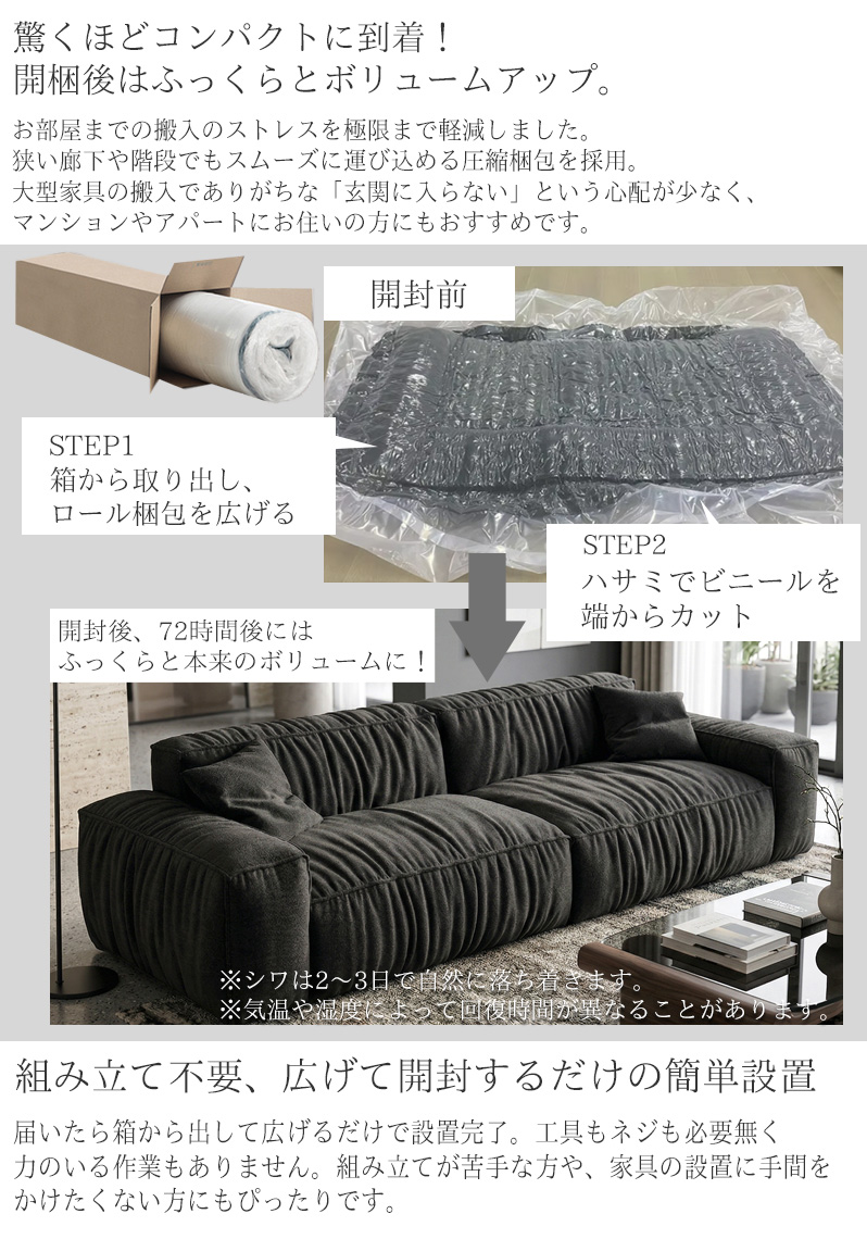 4.圧縮ソファの特性上、開封時には布カバーに目立つ折れシワがあります。