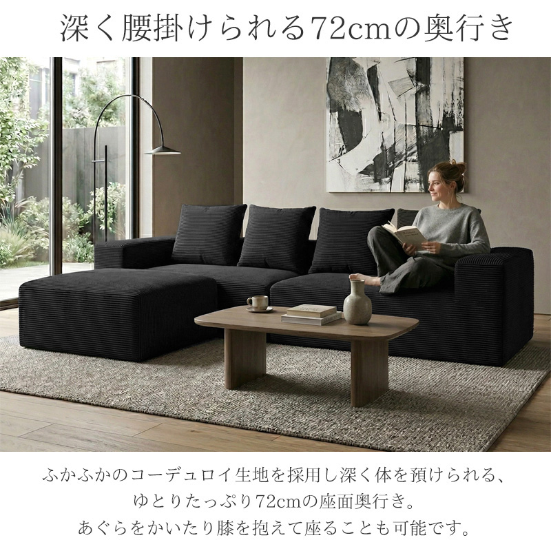 コンパクトに圧縮された状態で届きつつも、復元後はしっかりとした厚みと弾力があり一般的なソファと変わらない快適な座り心地を実現。座面奥行きは72cmの広々としたサイズ感で、深く腰を掛けたりあぐらをかいても窮屈感が無く、ゆったりとくつろいでいただけます。
