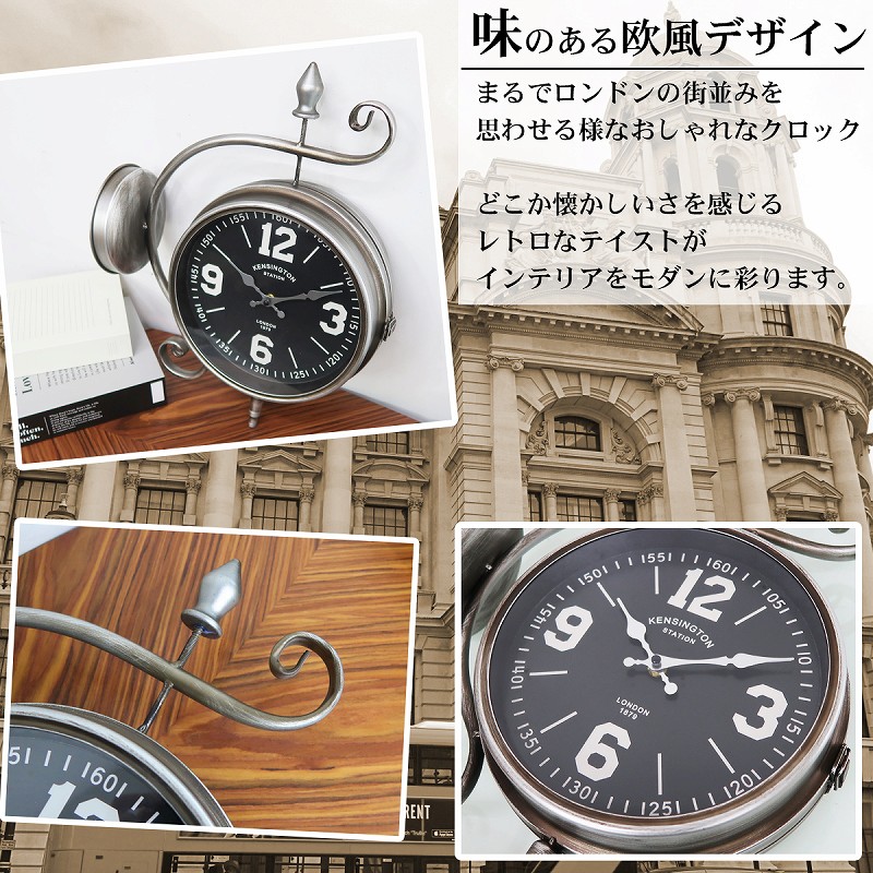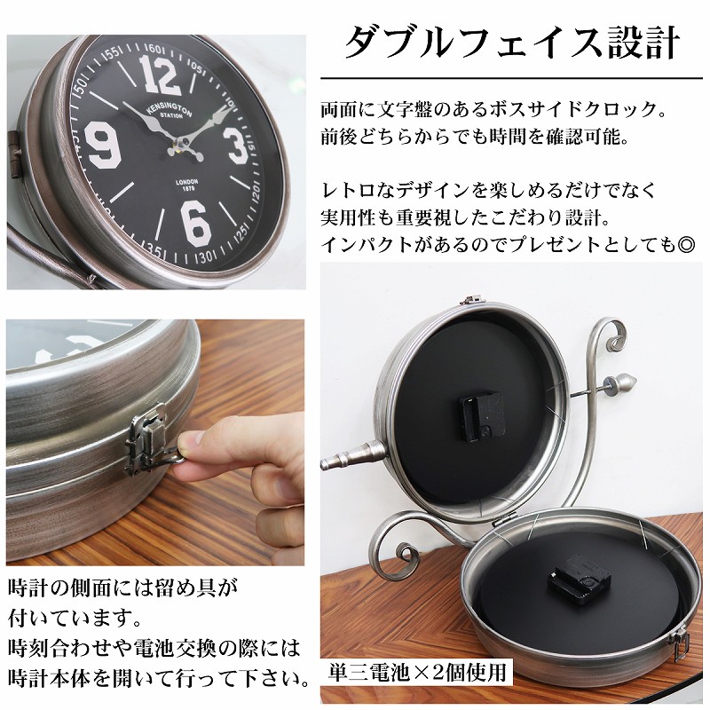 大型のため視認性が高く、また両面時計になっているので、どちらからでも時間の確認が可能なボスサイドクロックです。