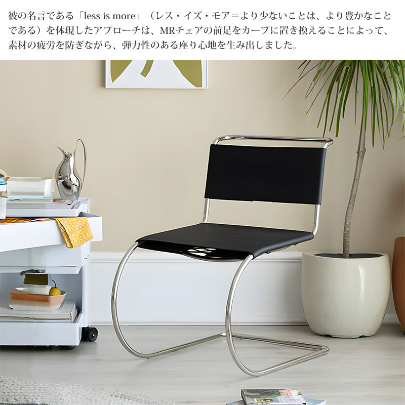彼の名言である「less is more」(レス・イズ・モア=より少ないことは、より豊かなことである)を体現したアプローチは、MRチェアの前足をカーブに置き換えることによって、素材の疲労を防ぎながら、弾力性のある座り心地を生み出しました。