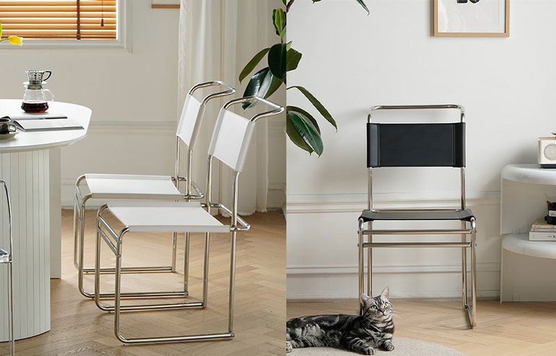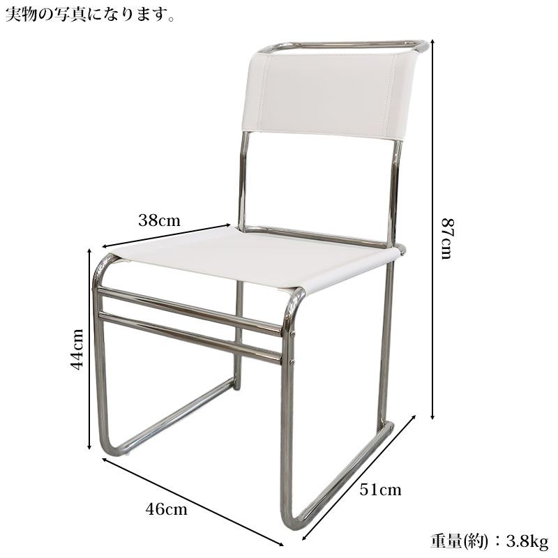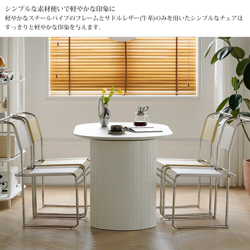 素材はスチールパイプとサドルレザー(牛革)のみで、ほぼ直線で構成されたミニマルなデザインです。見た目の通り軽量で、使い勝手も良好。椅子を引きやすいように持ち手をつけ、僅かに斜めにした背もたれにブロイヤーの心遣いを感じられます。