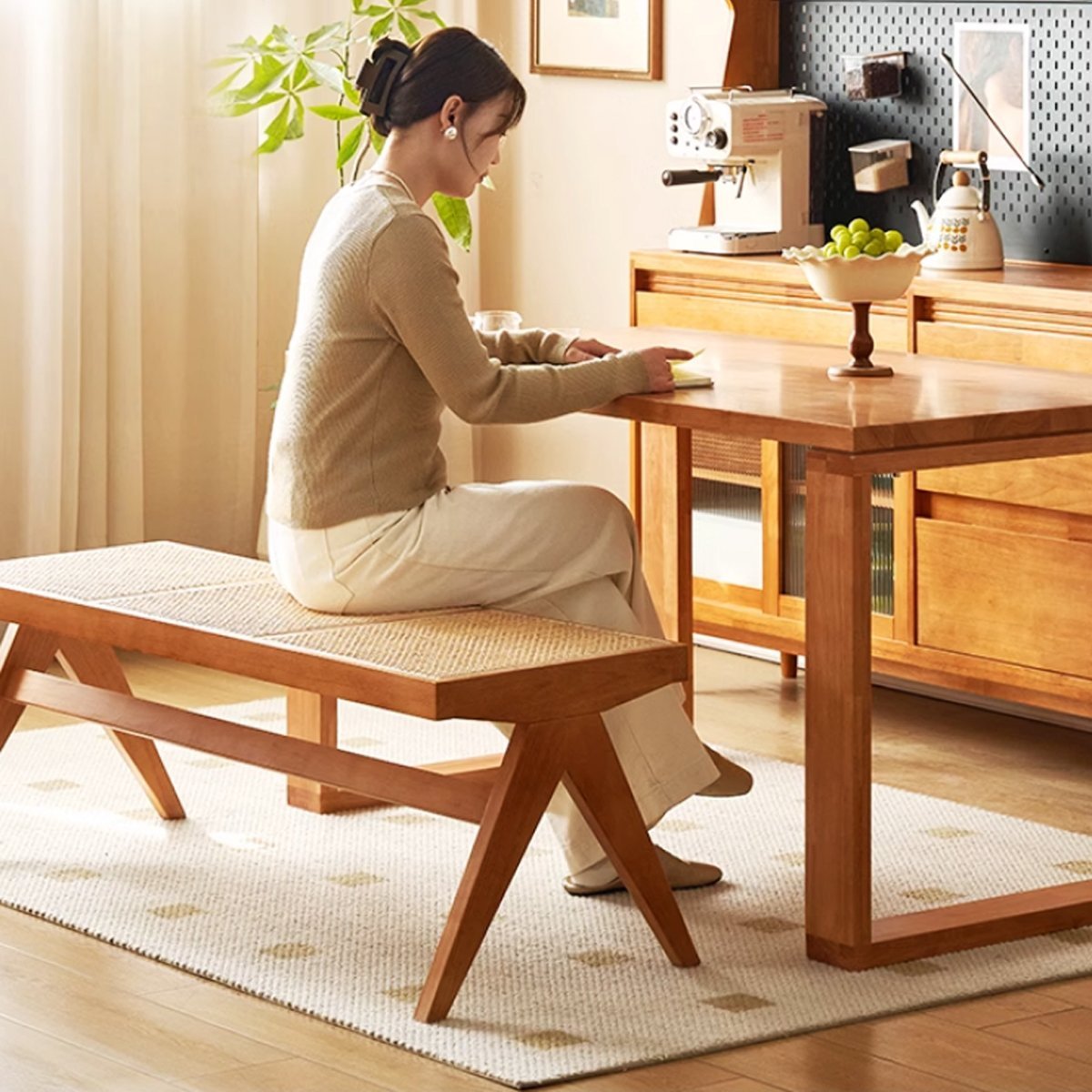 ゆったりとしたサイズ感でありながら、編み込み座面の透け感と自然素材の優しい風合いが圧迫感のない
