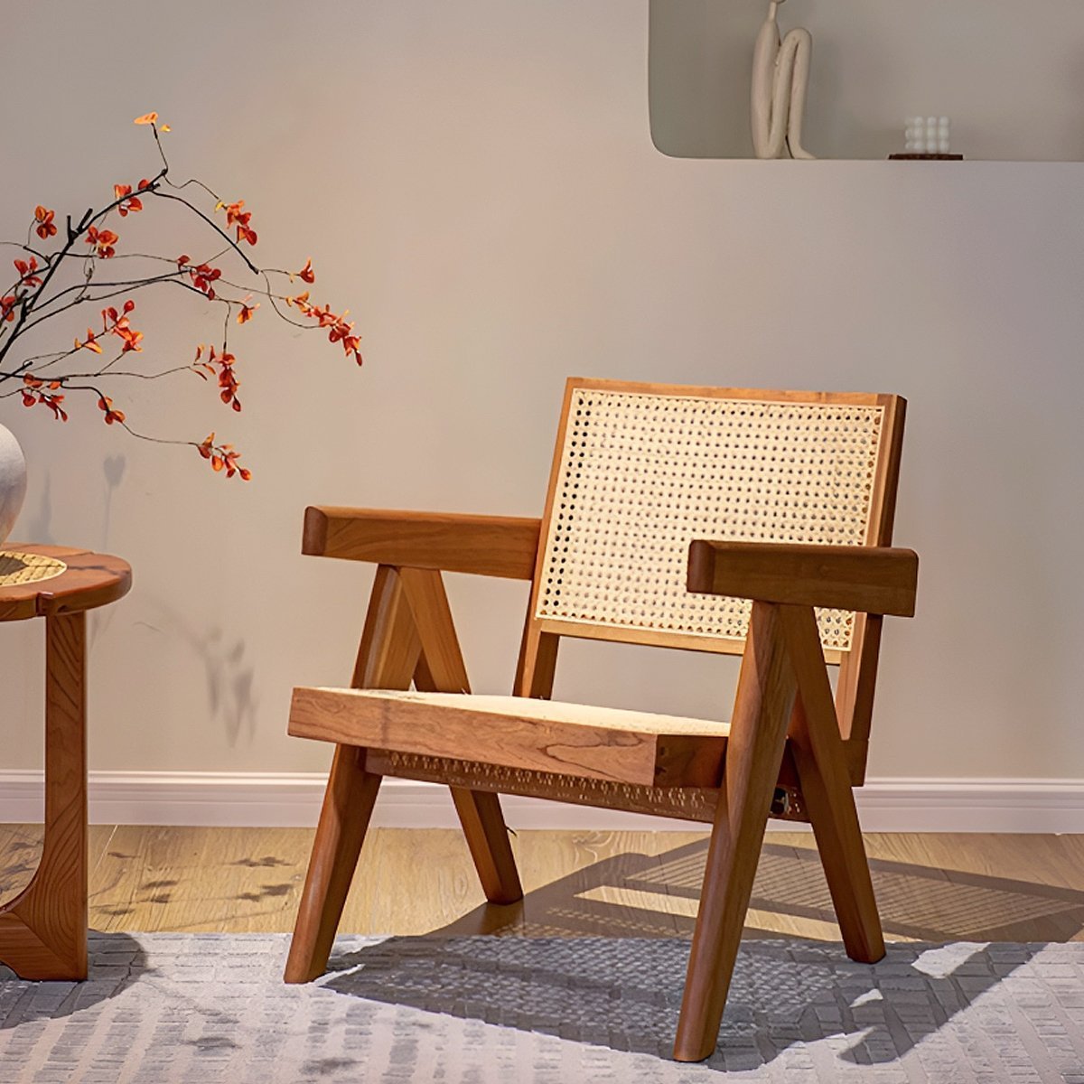 温かみのある天然木と和モダンな雰囲気のラタン素材の組み合わせが
