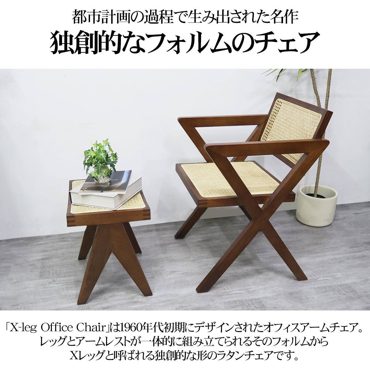 レッグとアームレストが一体的に組み立てられるそのフォルムからXレッグと呼ばれる独創的なチェアです。