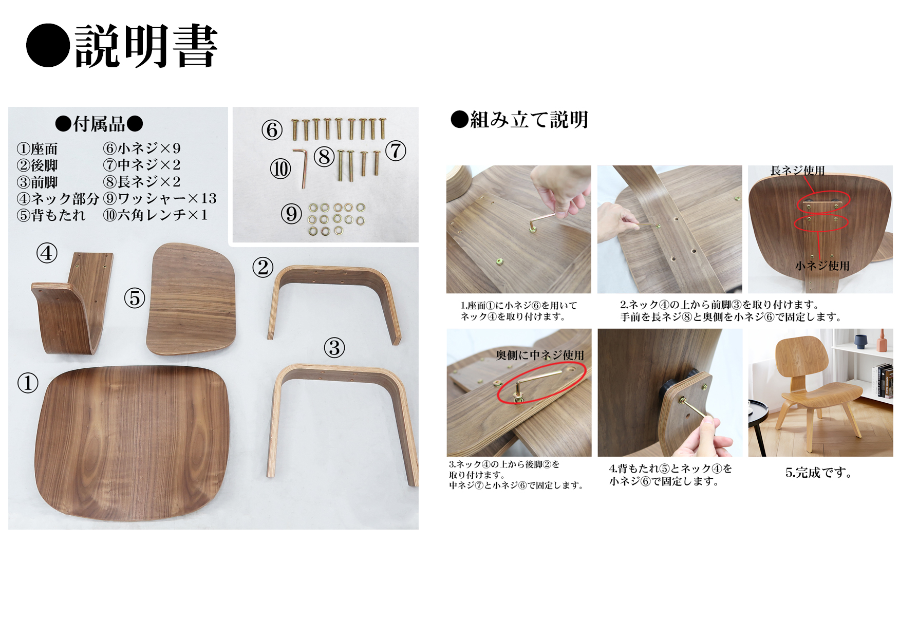 成形合板の特徴を生かし、前脚、後脚、背もたれ、座面、ネックと5つのパーツに分けて