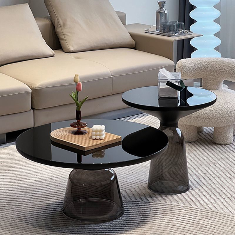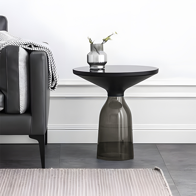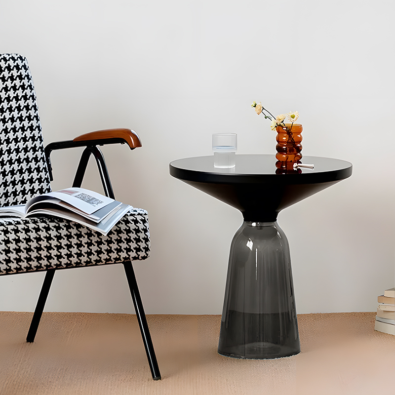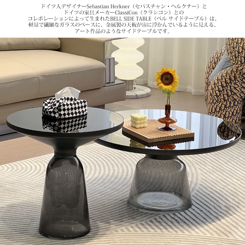 軽量で繊細なガラスのベースに、金属製の天板が宙に浮かんでいるように見える、アート作品のようなサイドテーブルです。