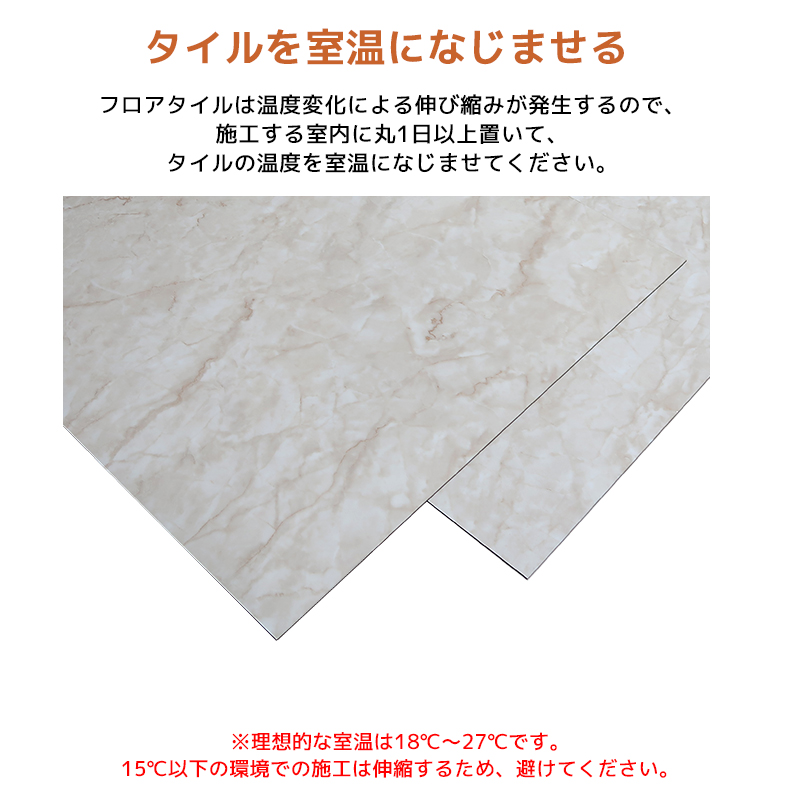 ・気温や湿度の変化でタイルが伸縮する場合があります。ぴったりと敷き詰めすぎると、伸びた際に突き合ってタイルが浮き上がってしまいますので少し隙間を開けながら敷きこんでください。