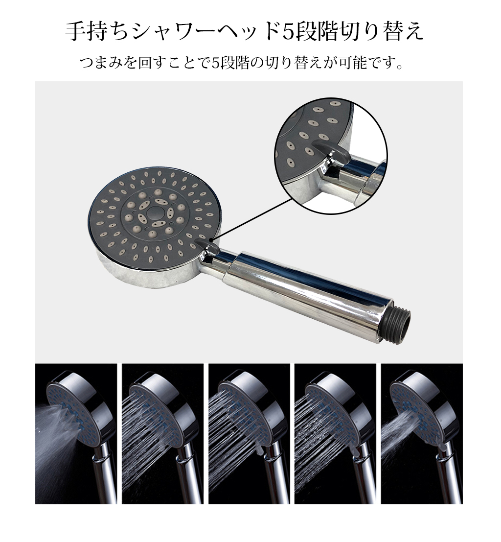 シャワーヘッドには節水、低水圧、増圧など5段階モードがありお好みで切り替えることができます。